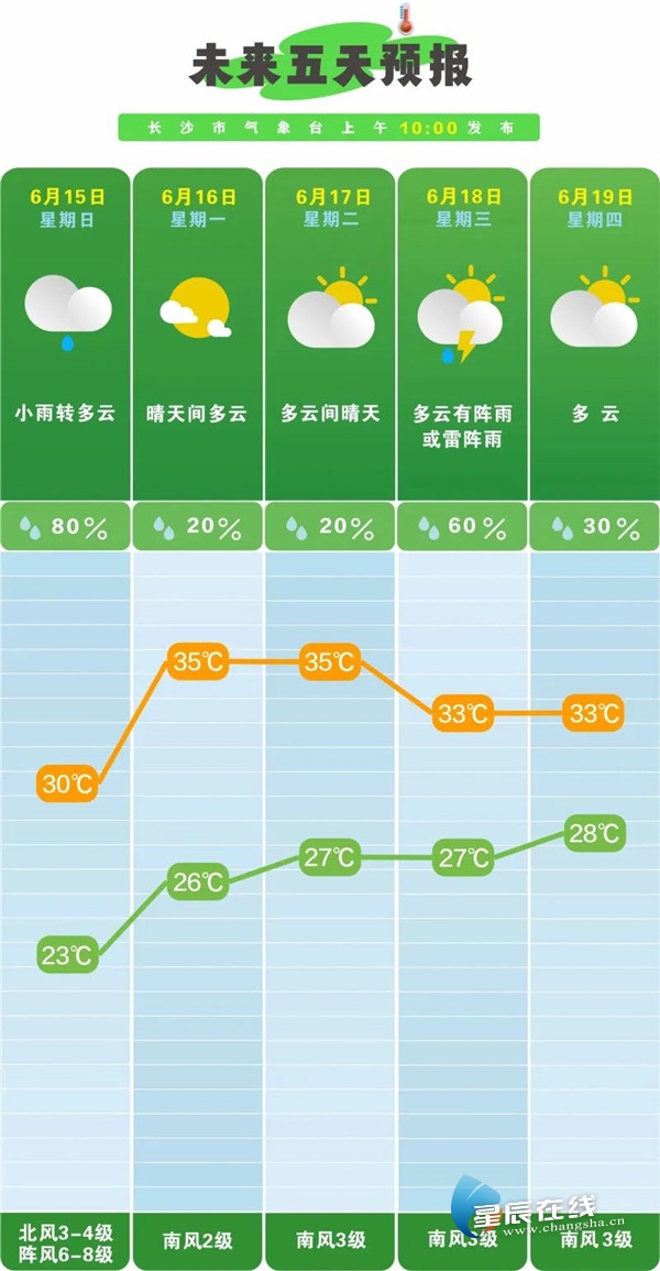 气象部门提醒,未来一周长沙晴雨相间,气温起伏较大,市民朋友明天早上出门记得带好雨具。降雨可能会对交通出行造成不便,大家要提前规划行程,注意交通安全。另外,后期温度会达到 35℃,请做好防暑降温措施,避免中暑,户外工作时要及时补充水分。