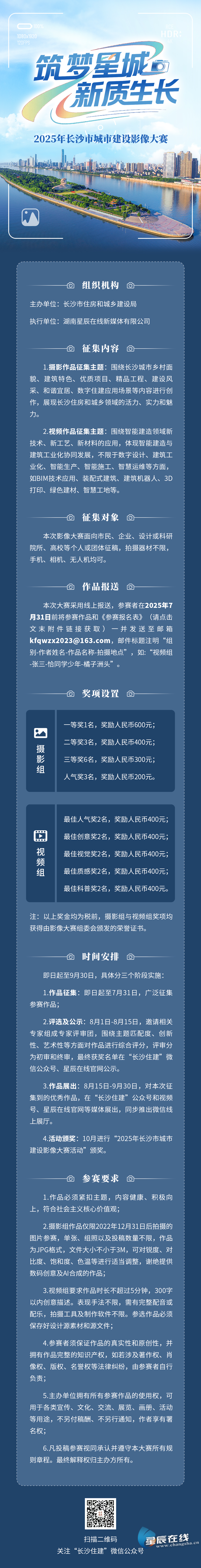 星辰在线6月16日讯(星辰全媒体记者 贺亚玲)当湘江边的阁楼与晚霞同框,当老巷子的青石板路映亮智慧路灯——2025年长沙市城市建设影像大赛正式发出“英雄帖”:即日起至7月31日,无论你是用手机随手拍的晨练大爷,还是用无人机航拍工地的工程师,无论是记录潮宗街青石板的岁月留痕,还是长沙高楼耸入云端的科技感,只要镜头对准长沙城市建设的蜕变,你就是这座城市的“编剧”,你的镜头,就是城市推荐信。