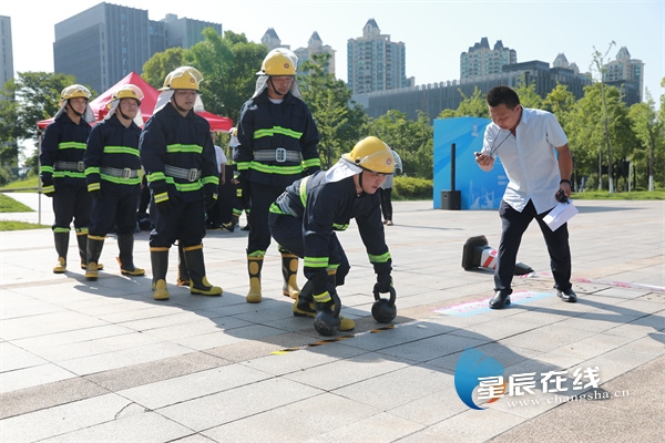 活动现场,星沙街道微型消防站拉练比武决赛上演。来自街道各社区的10支代表队伍围绕搬运重物折返接力跑和灭火器油锅接力灭火等科目展开角逐。
