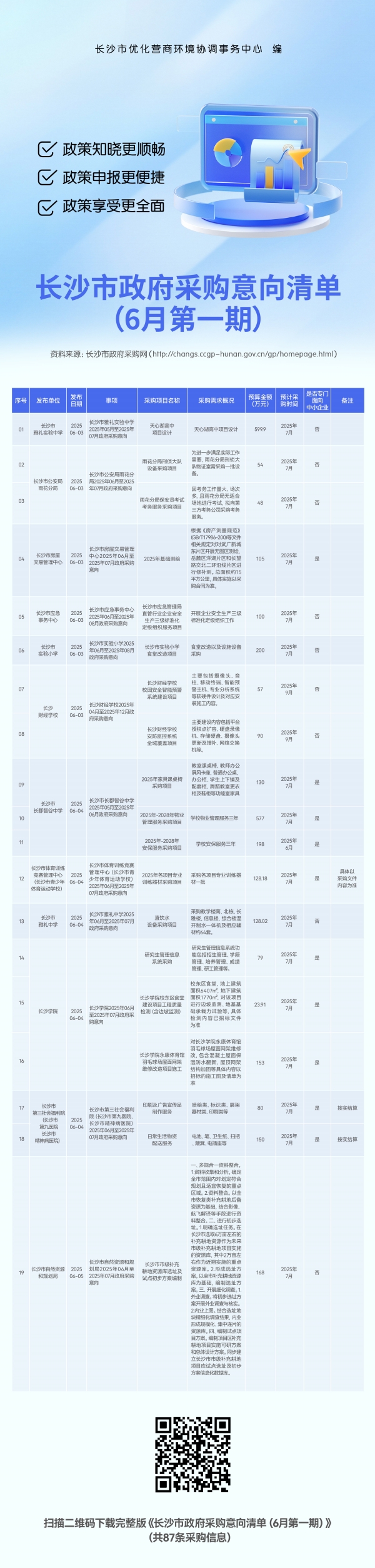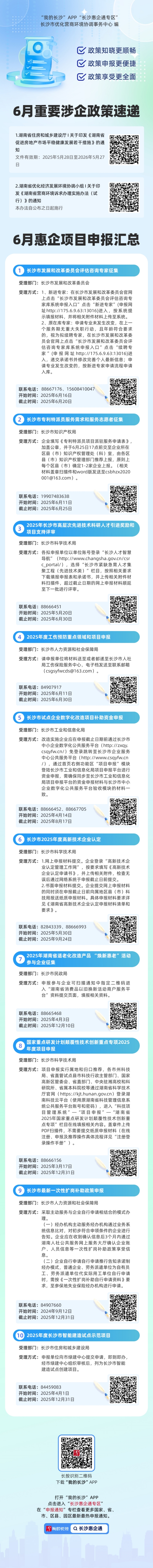 星辰在线6月18日讯(星辰全媒体记者 孙烨)长沙市优化营商环境中心持续打造优良涉企政策环境,不断优化政策服务,梳理汇总长沙涉企政策资讯,连续推出“重要涉企政策速递和惠企项目申报”速览长图和“长沙市政府采购意向清单”,助力市场主体更好知政策、用政策、享政策。现推出6月政策长图。