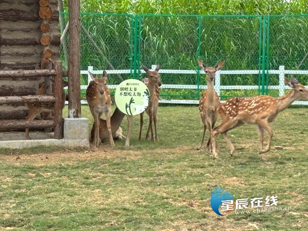 乘坐观光车来到麋鹿生活区,这里通过恢复30余种湿地原生植被,还原了洞庭湖湿地的多样场景,构建了“夏水冬陆”的动态栖息系统。“网红”麋鹿点点从野外救助而来,一年生一崽,如今已育有八只。呦呦农场里,游客们可以沉浸式体验喂养麋鹿,了解救助知识,观察麋鹿的吃住行。