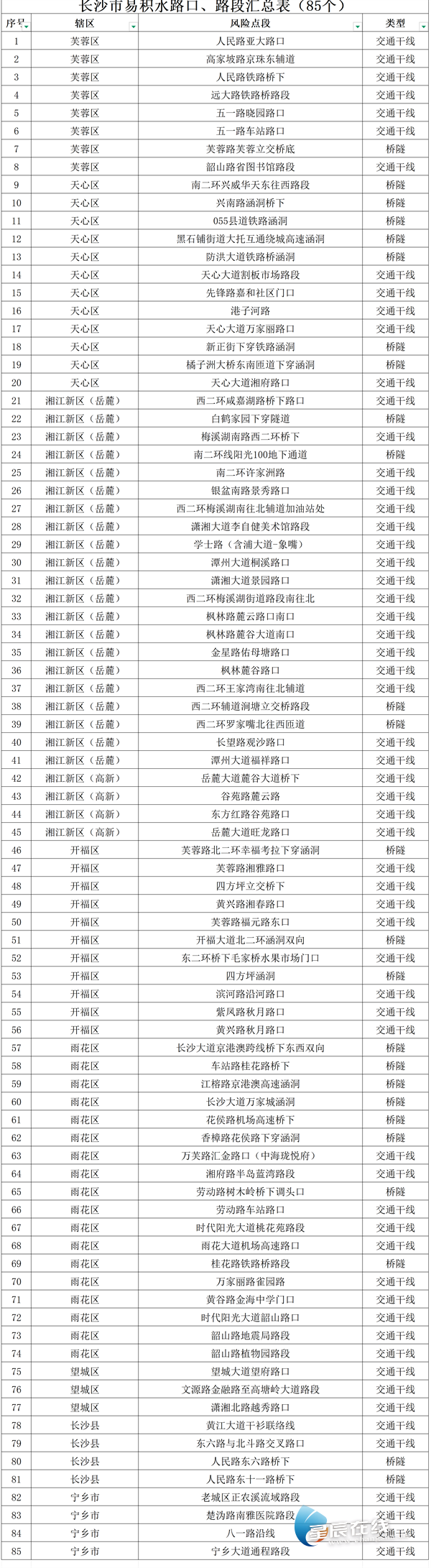 星辰在线6月20日讯(星辰全媒体记者 周子豪)近日,长沙市将迎来一轮强降雨天气,为有效应对强降雨天气带来的城市内涝及次生灾害,长沙公安交警根据近年来暴雨天气道路积水情况,公布全市85处易积水路口路段。
