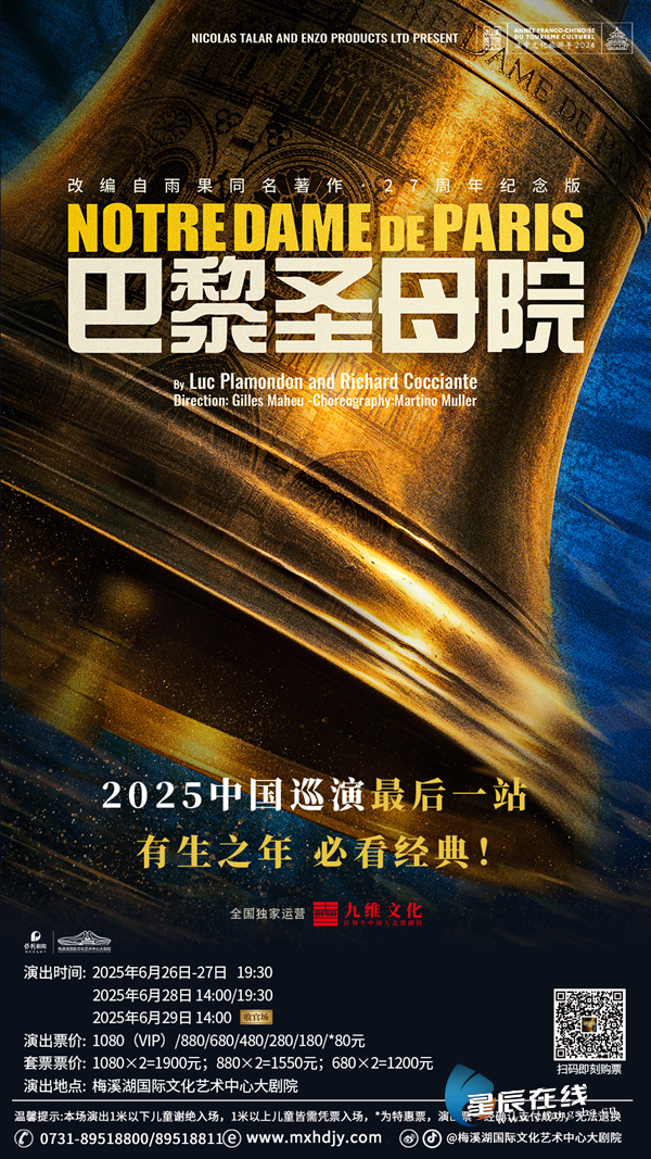 星辰在线6月23日讯(通讯员 尹栎晴)备受全球推崇的世界级传奇音乐剧《巴黎圣母院》,将于2025年6月26日至29日在长沙梅溪湖国际文化艺术中心大剧院连演五场,标志着其2025年中国巡演盛大收官。这部与《悲惨世界》《剧院魅影》《猫》并称“世界四大音乐剧”的巅峰之作,将以其无与伦比的艺术魅力,为星城观众献上一场视听盛宴。