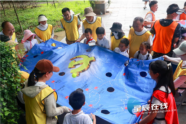 星辰在线6月24日讯(星辰全媒体记者 周子豪 通讯员 刘双)初夏的湖南省植物园内,一阵阵欢快的脚步声打破了晨间的宁静。6月24日,砂子塘天华小学的40余组亲子家庭正在进行一场别开生面的“长征”体验。二年级的刘奕贤小朋友举着手机,兴奋地向妈妈展示刚刚获得的“飞夺泸定桥”虚拟勋章,稚嫩的脸庞上写满了自豪。