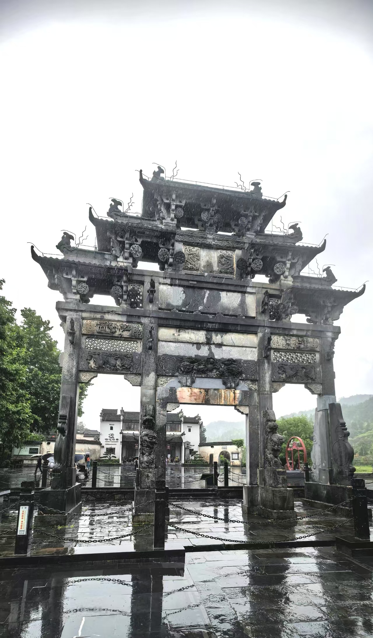 游览西递村时正是细雨霏霏。撑着雨伞在街巷穿行,雨滴轻叩青石板,溅起岁月的水花,似乎在唤醒陈年旧梦。李白说:“黟县小桃源,烟霞百里间”。雨后的西递云雾轻笼,粉墙黛瓦与水墨田野相融,小桥流水与满目新绿相映,漫步在这美丽的千年古村,仿佛行走在千年诗意里……