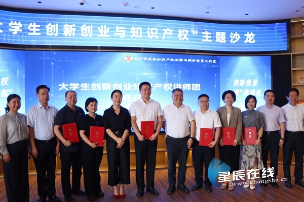 星辰在线6月24日讯(星辰全媒体记者 文春燕 刘星雨)6月24日,长沙市知识产权局联合长沙市政协知识产权创新与保护委员工作室举办“大学生创新创业与知识产权”主题沙龙活动。长沙市政协主席、党组书记陈刚,市政协副主席陈剑文,市政协秘书长、党组成员郑力虎,市知识产权局党组书记、局长侯向宇出席活动。
