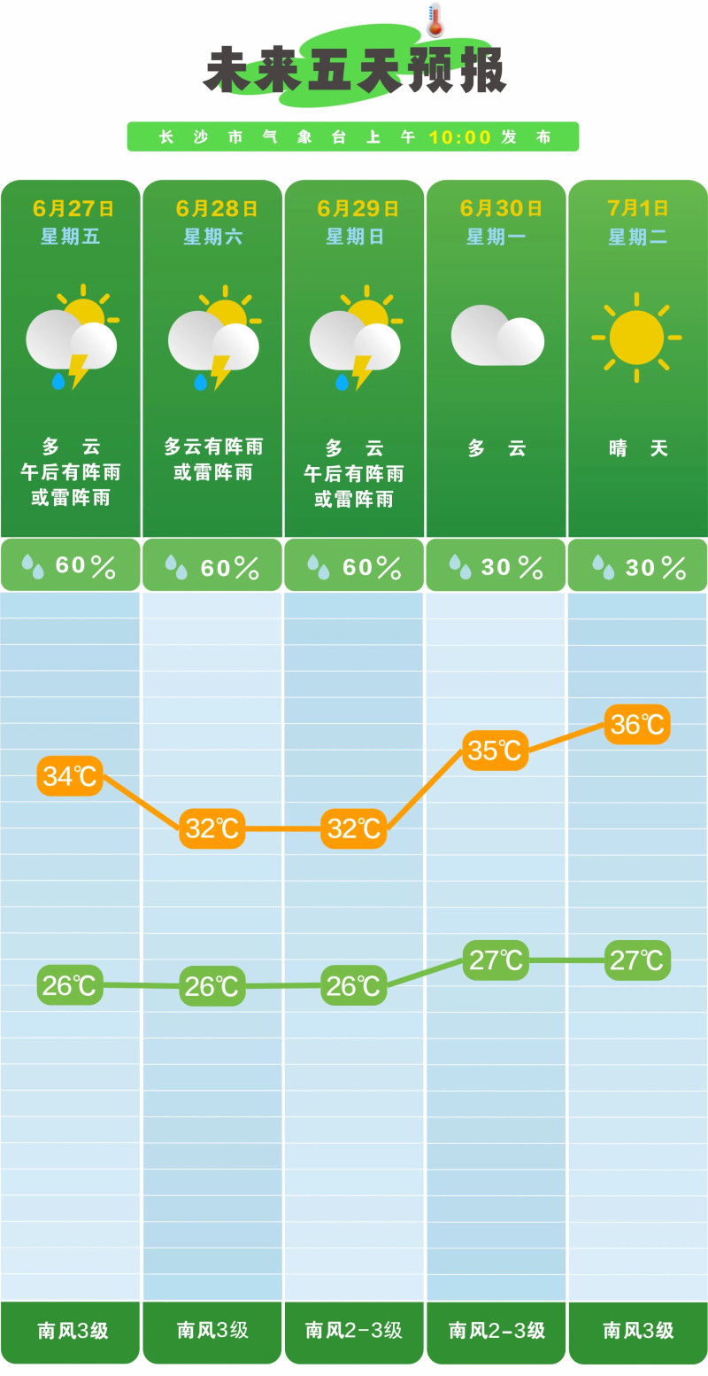 市气象台预计,未来一周长沙降雨偏少,气温偏高,6月26日到29日,受副高边缘暖湿气流影响,多云为主,午后多分散阵雨或雷阵雨,其中27日长沙多云,午后有阵雨或雷阵雨,26℃至34℃;6月30日到7月2日,晴热高温天气为主。