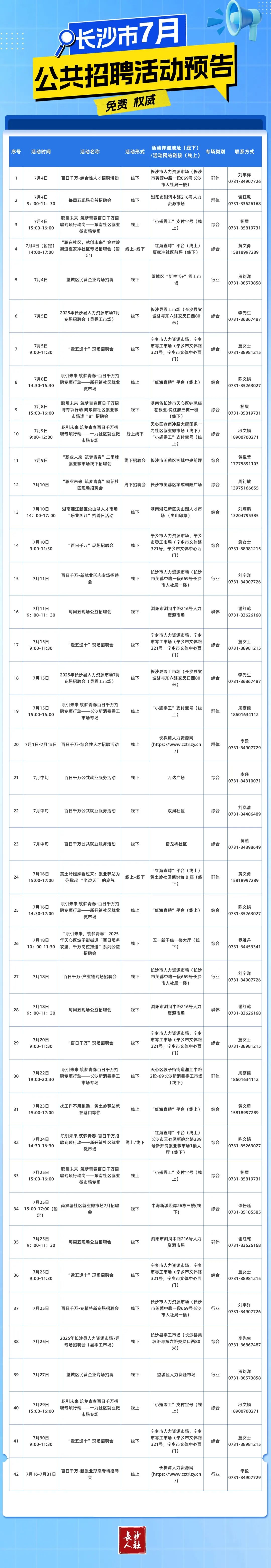 星辰在线6月27日讯(星辰全媒体记者 刘孟妮) @正在找工作的小伙伴,7月的公共招聘活动预告出炉啦!据悉,长沙市线上线下在7月内共有42场招聘活动,不要错过哦!
