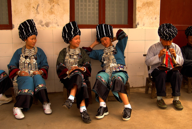 ◎ 2005年,花垣雅酉,戴花帕的苗族姑娘,吹唢呐的男子头缠的花帕又称“人字帕”。