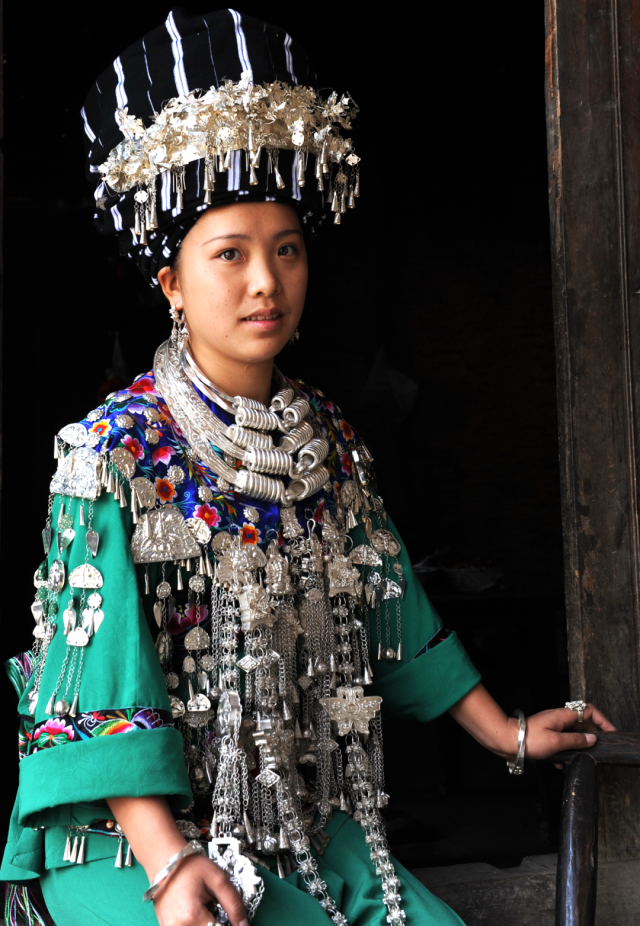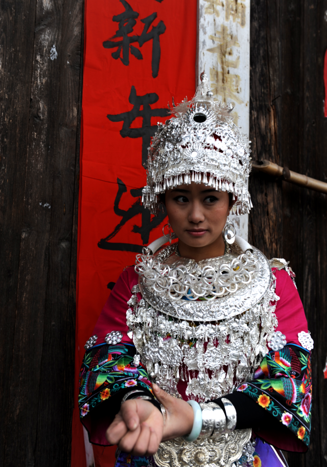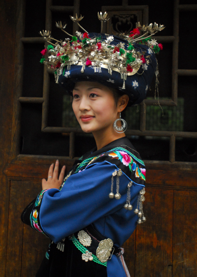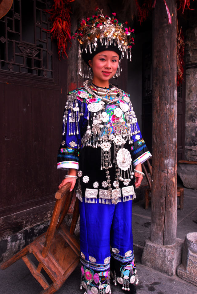 ◎ 2007年,凤凰山江,身着清代苗服的姑娘,这是清代苗族大户人家小姐的盛装,披肩、袖口、裙边的花纹装饰,均为手工绣成。