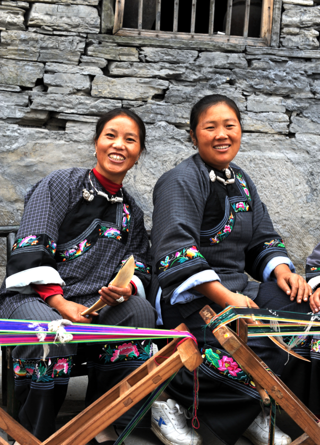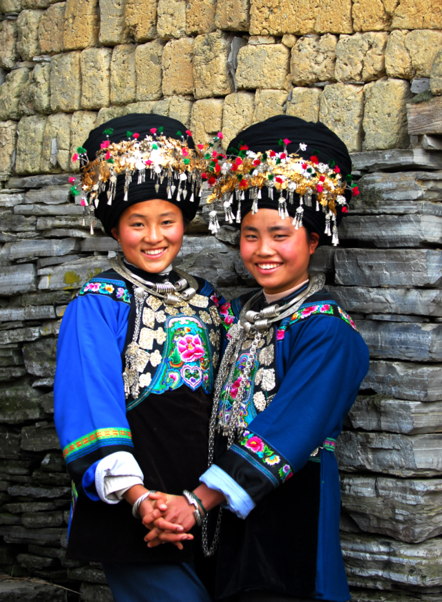 ◎ 2007年,凤凰早岗,青春作伴,苗女服饰由织、绣、挑、染等多种工艺做成。