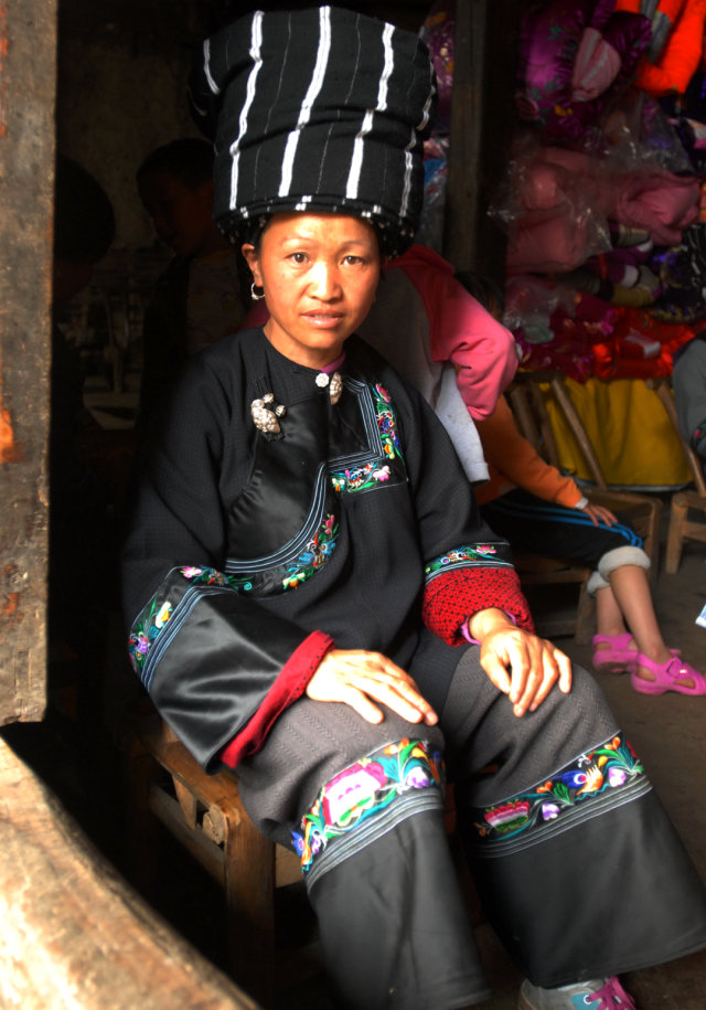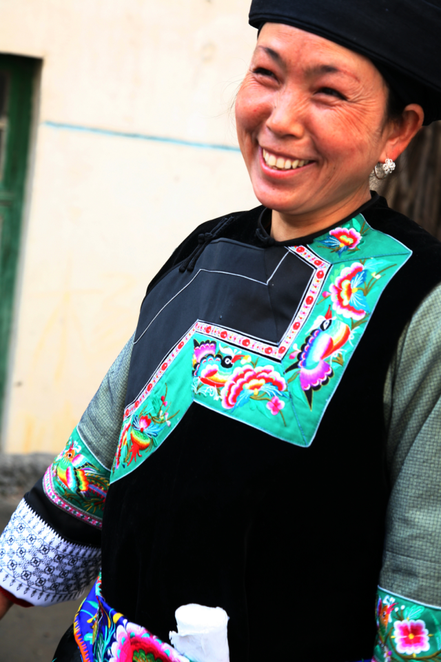 ◎ 2009年,吉首矮寨,身背苗绣花袋的妇女。