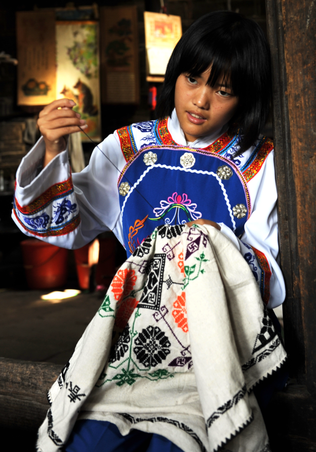 ◎ 2009年,泸溪潭溪,学做苗族数纱的姑娘,所穿服饰系湘西“白苗”装。