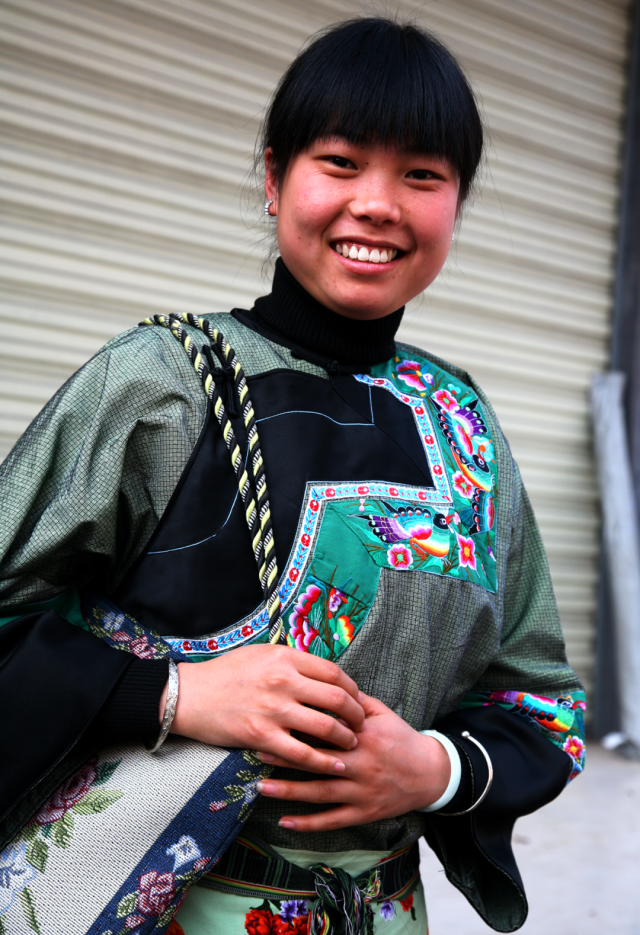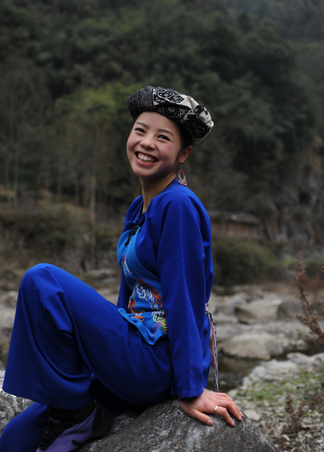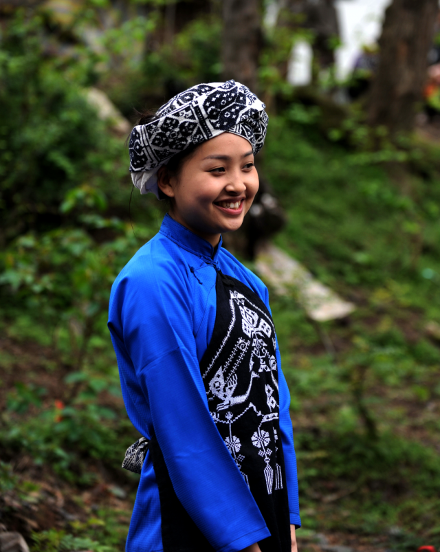 ◎ 2010年,吉首丹青,这一带苗族姑娘头戴花帕,身着蓝士林布服饰,腰围苗绣麻裙。