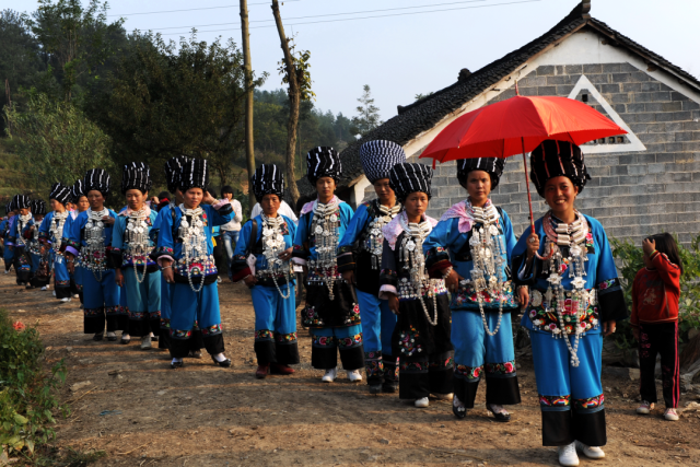 ◎ 2009年,凤凰两林,送亲的苗族姑娘,穿戴美不胜收。