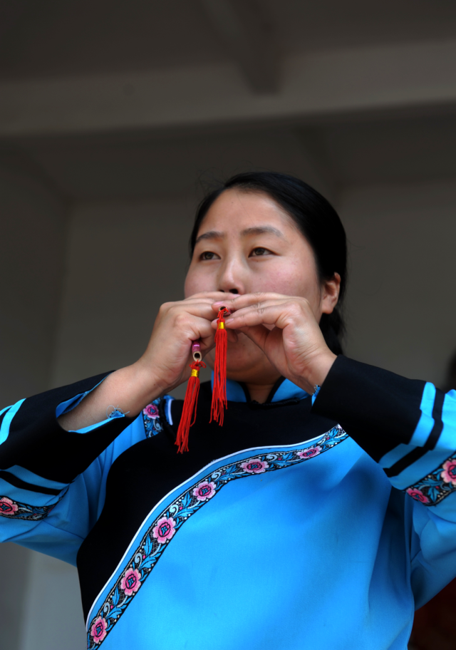 ◎ 2010年,龙山靛房,吹土家咚咚喹的妇女。