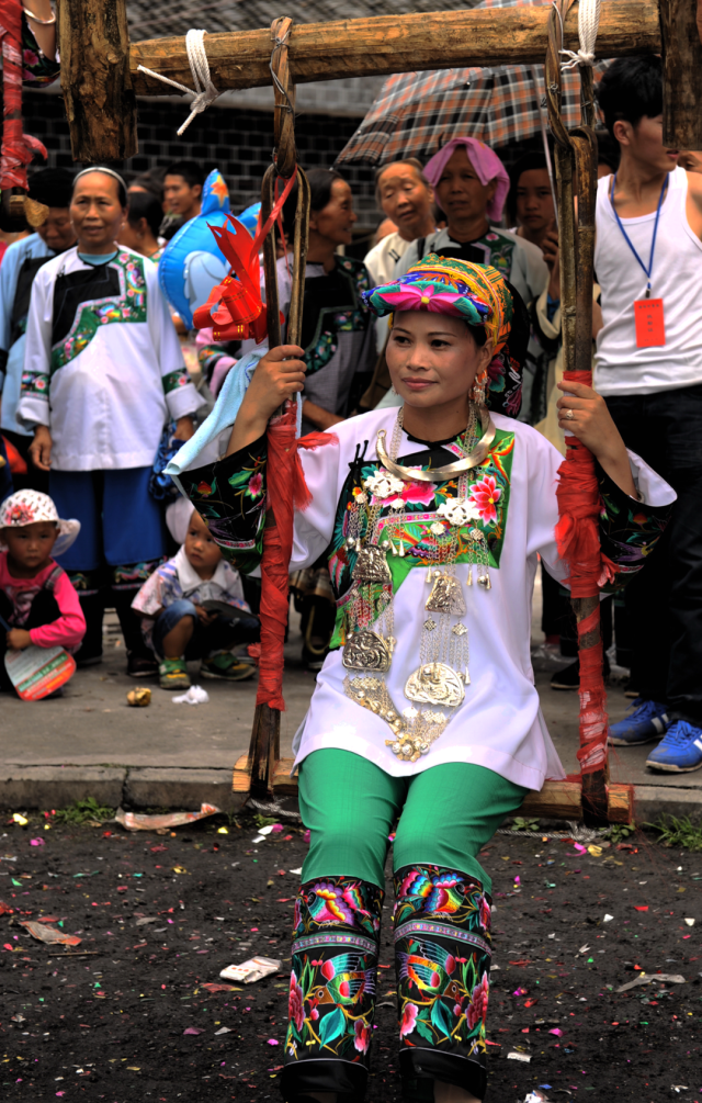 ◎ 2011年,花垣排料,荡秋千的妇女,这是吉首矮寨坡头、花垣排料、保靖吕洞山一带,苗族妇女穿着的盛装。