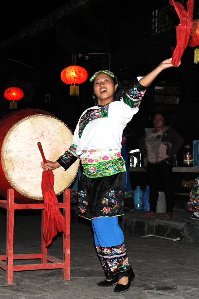 ◎ 2014年,保靖吕洞山,入夜击打苗鼓的姑娘。