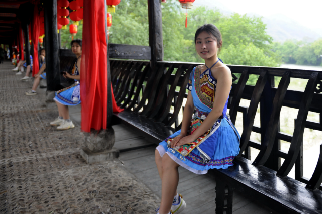 ◎ 2023年,龙山捞车河风雨桥,参加文旅活动迎客的土家族姑娘,这种迎客服装经过改良,融入了现代时装元素。