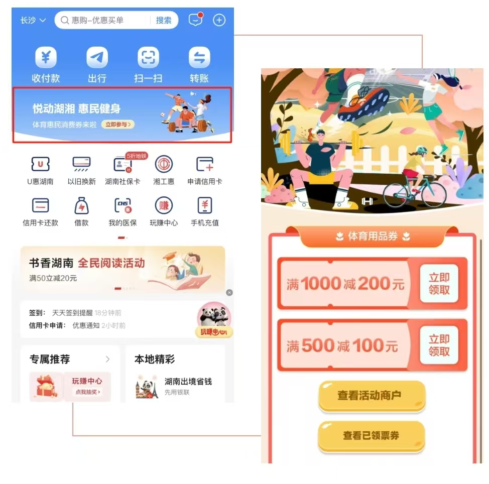 云闪付app-首页-“悦动湖湘 惠民健身 体育惠民消费券来啦”-选择所需券种领取