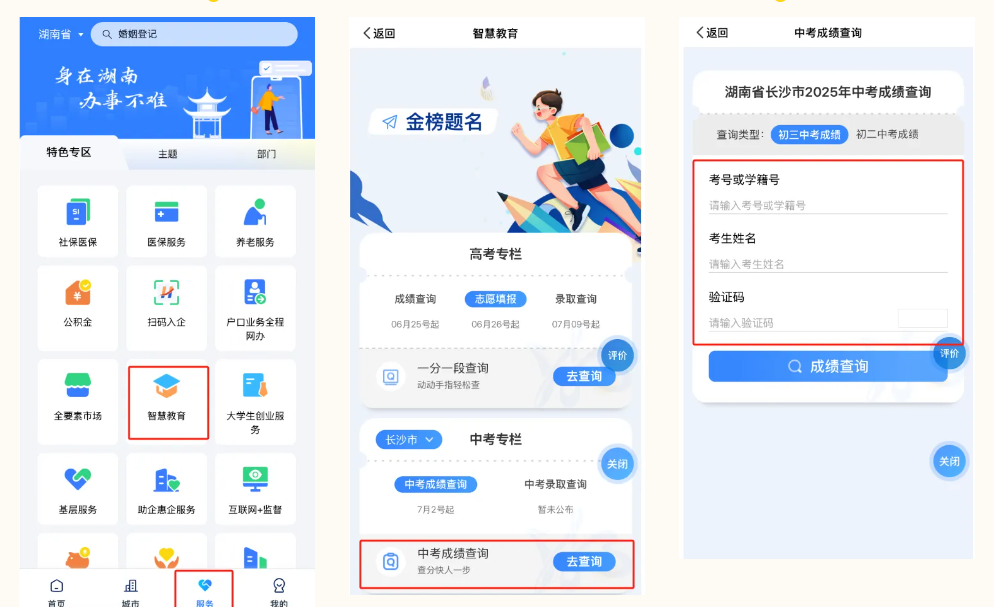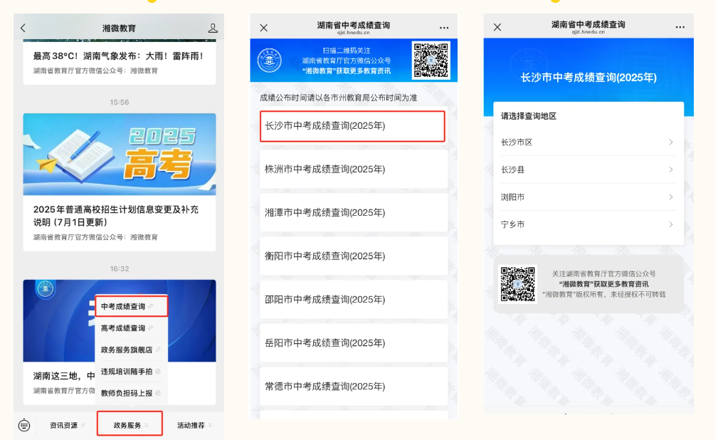 点击“湘微教育”微信公众号页面下方菜单栏“政务服务”-“中考成绩查询”-“长沙市中考成绩查询(2025年)”,根据页面提示输入考生信息进行查询。