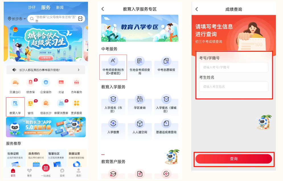 登录“我的长沙”APP服务页面,选择“教育入学”-“中考成绩查询”服务,根据页面提示输入考生信息进行查询。