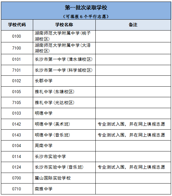 (一)今年新增3所公办普通高中学校新校区招生,分别是湖南师大附中(大泽湖校区)【招生代码7100】、长沙市一中(科学城校区)【招生代码7101】、雅礼中学(光达校区)【招生代码7105】。