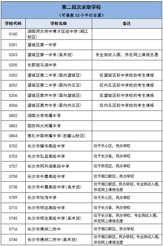 (二)望城区第二中学、望城区第六中学今年继续面向望城区和内五区(湘江新区、芙蓉区、天心区、开福区、雨花区)初中学校单独招生。其中,望城区初中学校的考生填报望城区第二中学和望城区第六中学时,招生代码分别为【0202】【0206】。内五区初中学校的考生填报望城区第二中学和望城区第六中学时,招生代码分别为【8202】【8206】。