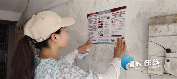 (社区工作人员在楼道粘贴安全宣传海报。通讯员供图)