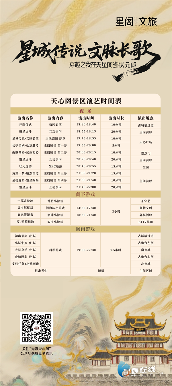 星辰在线7月9日讯(星辰全媒体记者 彭穗)7月8日起,长沙天心阁景区暑期特别策划“星城传说・文脉长歌”——穿越之我在天星阁当状元郎沉浸式剧游活动正式开演。此次活动将以独特的剧情设计和丰富的互动体验,带领游客穿越回大明长沙府,感受地道长沙市井文化,沉浸式体验古代学子一路求学赶考的艰难与艰辛、惊险与惊喜。