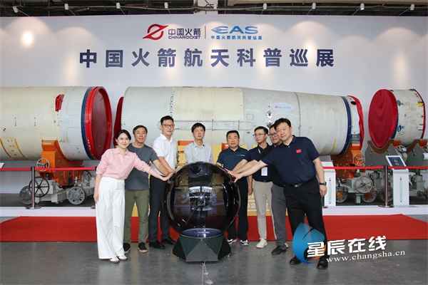 星辰在线7月12日讯(星辰全媒体记者 郭凤湘)7月12日上午,《星耀长沙·中国火箭航天科普巡展》在长沙红星国际会展中心东门区拉开帷幕,现场不少航天爱好者及慕名而来的观众共同见证这一启幕时刻。作为中国长征火箭有限公司近年来首次授权的官方标杆性航天科普展览,这场总面积达6000平方米的盛宴,不仅带来了运载火箭实物、珍稀陨石等“硬核”展品,更让现场观众,尤其是孩子们沉浸式触摸到了航天温度。