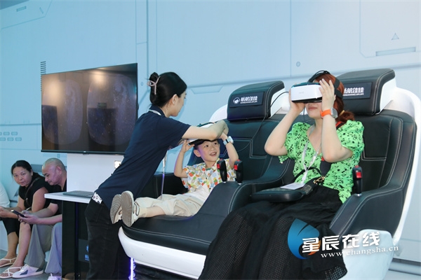 (小朋友和家长在航天梦想互动工场板块一起戴上VR眼镜体验太空遨游。)