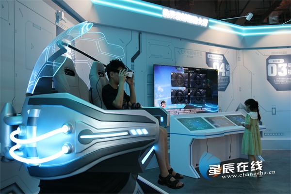 深空幻境板块,运用前沿数字技术打造沉浸式月球与火星场景,通过模拟异星环境,让观众仿佛置身月球表面与火星旷野,感受深空探测的奇妙魅力。不少小朋友穿上宇航服化身小小宇航员实现“登月”体验。“感觉真的在太空遨游!”在航天梦想互动工场板块,这里成了孩子们的乐园,发射舱中,孩子们佩戴VR眼镜感受发射全流程,360度真实体验到遨游在地平线与天空之间的感觉。还有的和父母一起开启航天知识问答挑战,通过互动设备真实触摸、动态感知,在体验游戏中完成技能检验与知识收获。该板块引入珠海航展原套互动装置,并展示丰富航天文创产品,通过亲身体验与创意呈现,让航天梦想在互动中扎根。