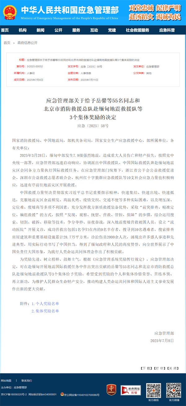星辰在线7月12日讯(星辰全媒体记者 宋婉冰)近日,应急管理部发布通报,对在赴缅甸地震国际救援任务中作出突出贡献的3个集体和55名个人予以奖励。其中,长沙市社会应急力量岳麓蓝天救援队队员谭章、王国强获嘉奖。