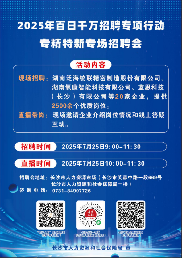 星辰在线7月23日讯(星辰全媒体记者 刘孟妮)为深入实施就业优先战略,促进高质量充分就业,进一步支持专精特新中小企业高质量发展。7月25日上午,由长沙市人力资源和社会保障局主办的2025年百日千万招聘专项行动——专精特新专场招聘会,将在长沙市人力资源市场举办。2500余个优质岗位,“职”等你来!