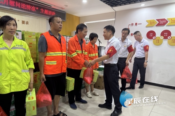 星辰在线7月24日讯(星辰全媒体记者 李政伦)烈日当空,热浪袭人,环卫工人等户外劳动者坚守岗位的身影令人动容。7月24日,长沙市出租汽车有限公司雷锋车队党员志愿者以实际行动践行初心使命,在长沙市芙蓉区恒达社区开展“红心向党,七月慰问送清凉”主题活动,为奋战在高温一线的“城市美容师”送去夏日清凉。
