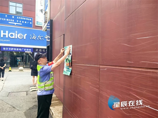 (芙蓉交警义警在粘贴交通安全宣传海报。)