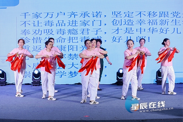 (芙蓉北路街道的综合艺术类节目《“五老红”照亮无毒梦》形式新颖,巧妙融合了多种艺术元素,传递了珍爱生命、远离毒品的坚定信念和正能量,成为当晚一大亮点。)