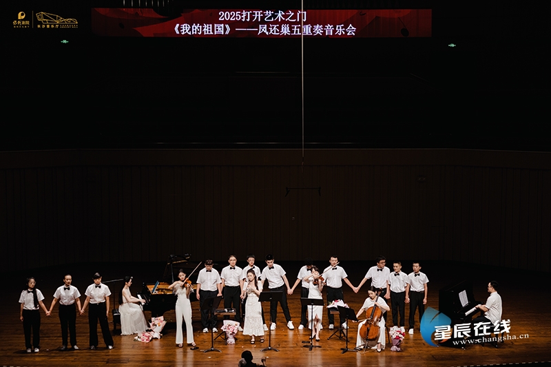 星辰在线7月26日讯(通讯员 雷乐依)7月25日晚,湘江之畔的长沙音乐厅·湘江大厅内,流淌着深情的旋律与动人的暖流。《我的祖国》——凤还巢五重奏音乐会在此倾情上演。五位才华横溢的青年演奏家以精湛的技艺,倾情演绎了《我爱你中国》的磅礴气势与《山·水》的隽永东方意蕴,为观众带来一场视听盛宴。