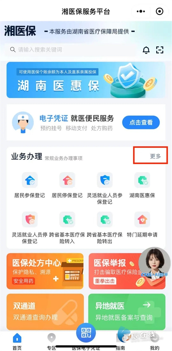 一、打开“湘医保”APP或小程序首页找到【业务办理】点击“更多”。