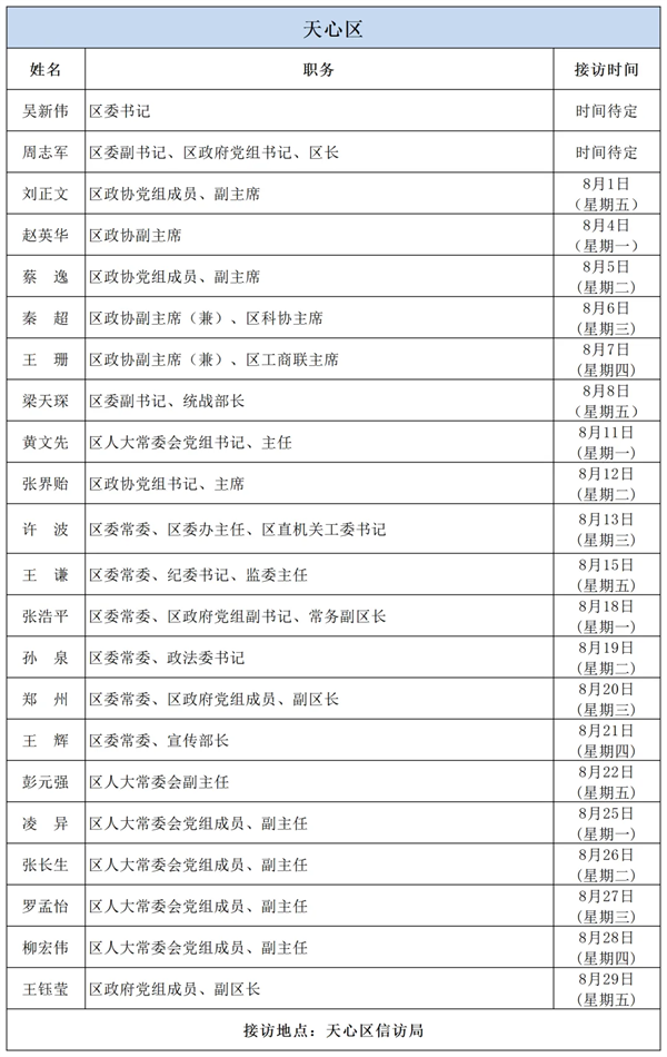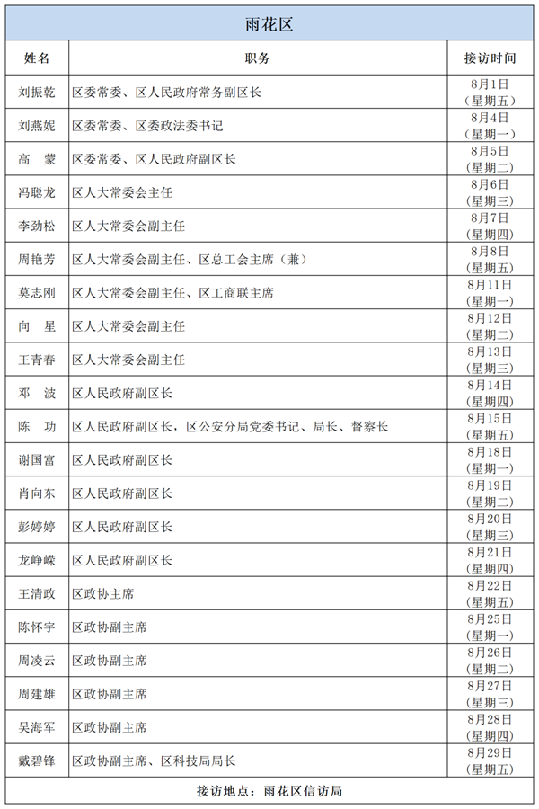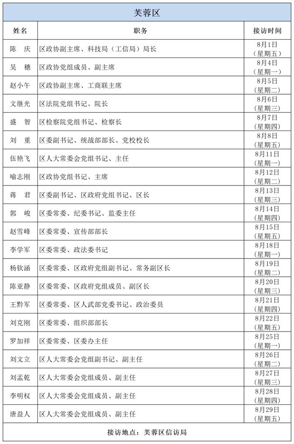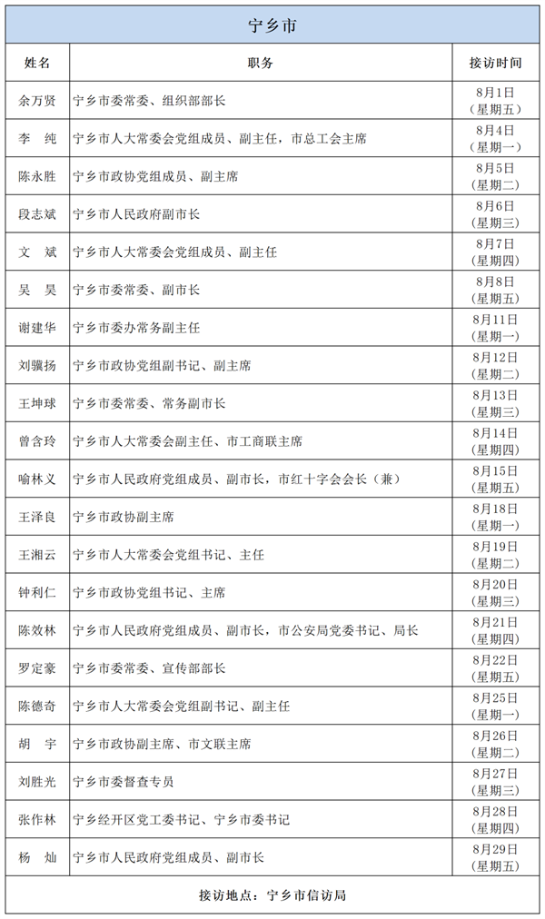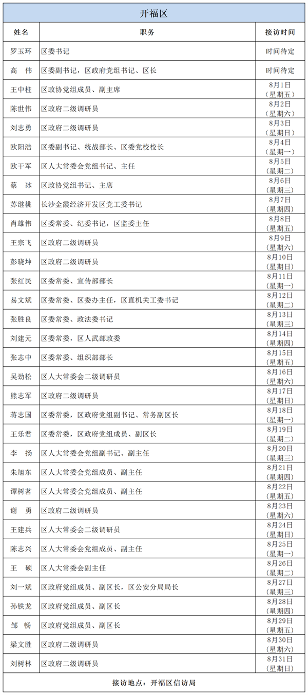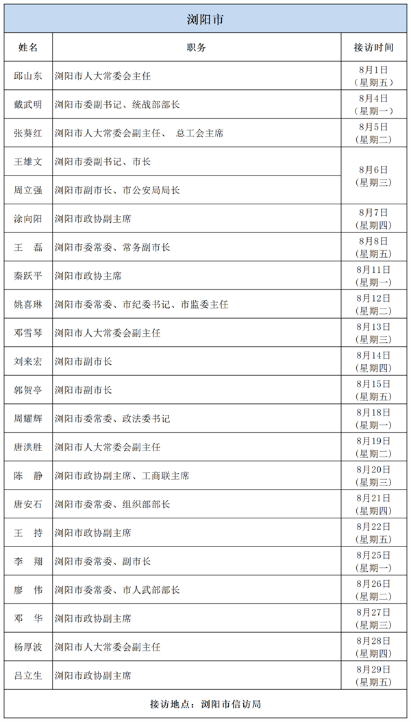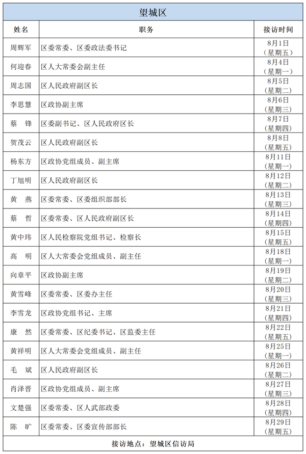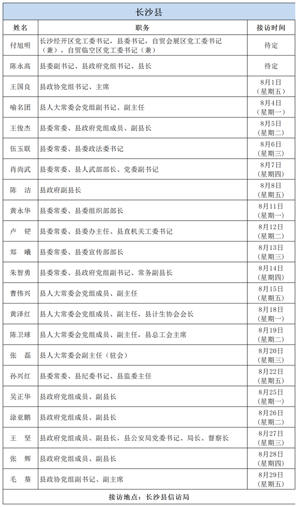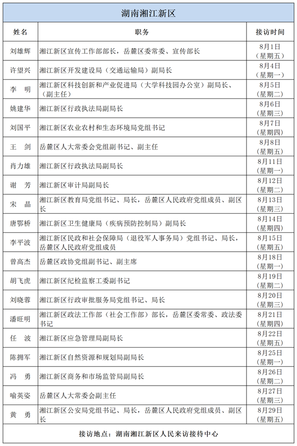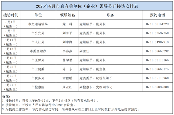 为密切联系群众,畅通信访渠道,依法及时就地解决群众合理合法诉求,现将2025年8月份湖南湘江新区、各区县(市)及相关市直单位(企业)领导接访安排予以公告,群众可根据公告的接访安排到指定地点反映诉求。