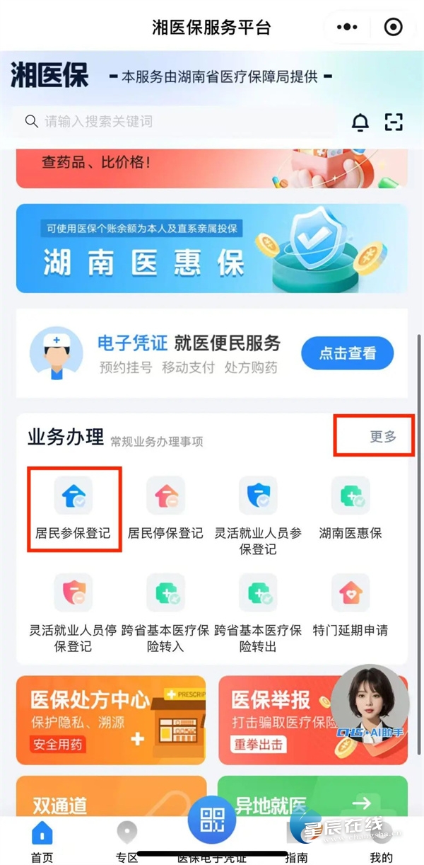 一、登录“湘医保服务平台”,在首页点击【居民参保登记】,或点击【业务办理】-【更多】找到该功能。