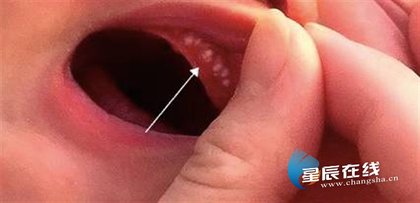 部分新生儿的上颚中线或牙龈处可见黄白色小颗粒,状似牙齿,称为马牙。它由脱落的上皮细胞或黏液腺分泌物堆积形成,通常不会引起不适,数周内可自行消退。