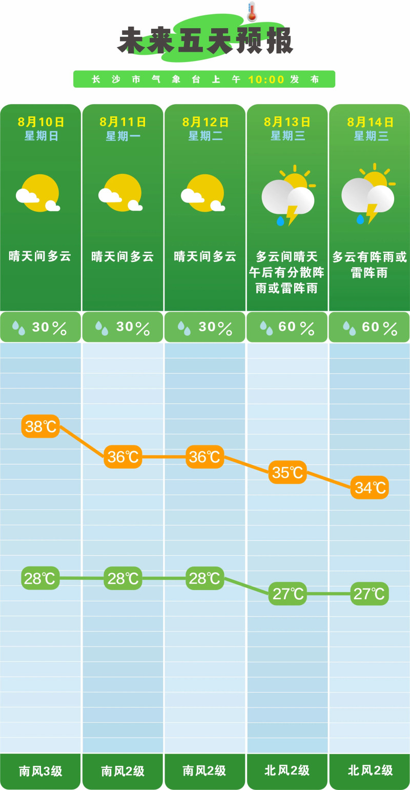 记者注意到,根据长沙市气象台最新天气预报,9日到10日,晴天或多云;11日到15日,晴天到多云,多午后阵雨或雷阵雨。其中,10日长沙最高气温达38℃,下周最高气温将下降至35℃左右。