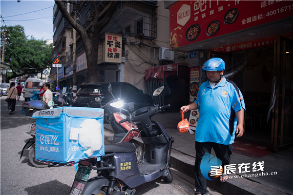 朱世中的蓝色外卖箱在人流里穿梭时,像一枚精准的指针。他的头盔檐下挂着一层薄汗,顺着下颌线滴在工装领口,晕出深色的圈。“富兴广场到了没?” 手机支架上的订单提示音连珠炮似的跳,他手腕一拧,电动车灵活拐过街角。这是他来饿了么的第三个月,富兴广场方圆五公里的每条小巷都刻在脑子里,每天忙得连轴转,最多时一天送七十多单。汗珠砸在车把手上,他抬手抹了把脸,镜片后的眼睛盯着前方:“早一分钟送到,顾客的汤面就少凉一分。”