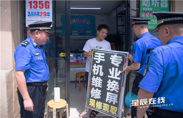 不远处,阙跃明正站在药店门口和老板聊消防隐患。这位东风路中队的党支部书记,2006年穿上城管制服,调到东风路两年多,制服后背总印着一片汗渍。“城管啊,七分是服务,两分是管理,剩下一分才是执法。” 他说着,伸手帮老板把门口的广告牌往里挪了挪,“你看这通道得留出来,高温天万一有个事,好进出。” 他总说 “管理的末端才是执法”,所以巡逻时口袋里总揣着创可贴和藿香正气水,哪家商户的冰柜坏了,哪个摊贩的遮阳伞歪了,他比谁都上心。