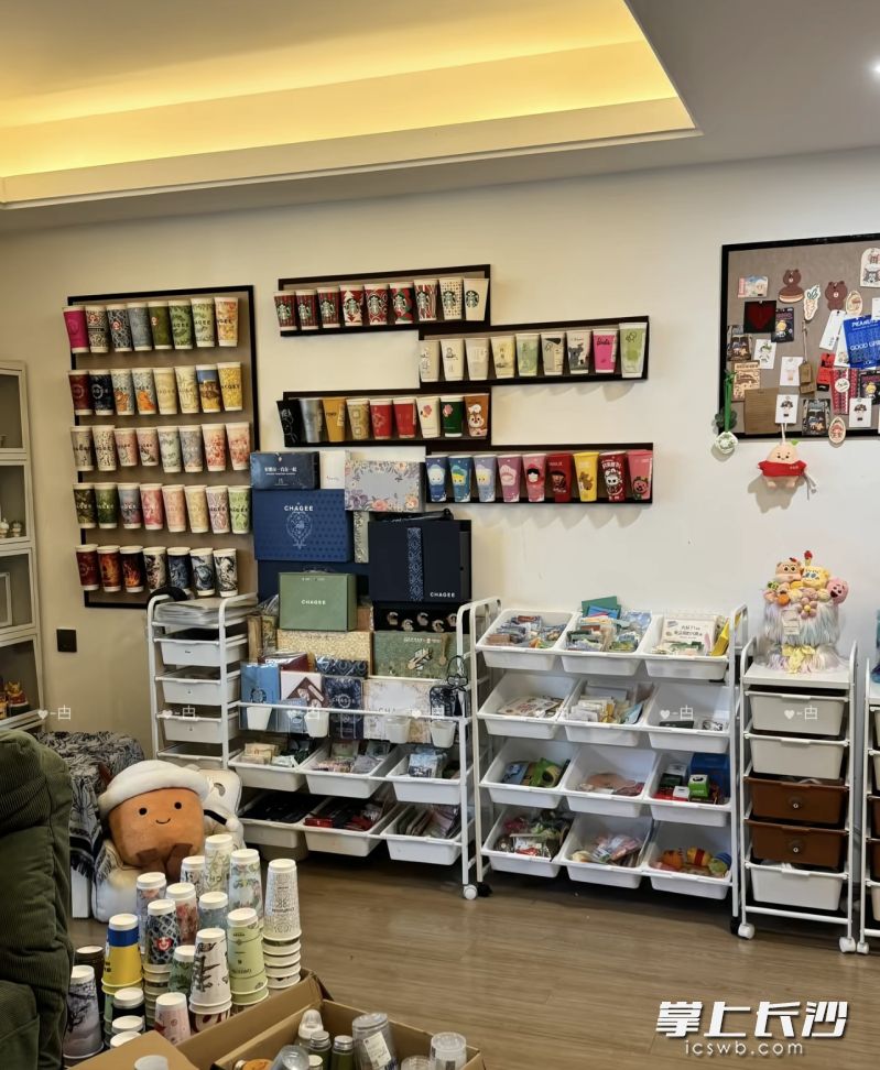 小甴向记者展示了自己的“奶茶博物馆”,各种周边分门别类,徽章、纸杯、挂件等摆满了整屋。“前几年在网上刷到了茶颜悦色的周边,一下子就爱上了收集。从最开始的杯套再到冰箱贴,还有好看的马克杯,我全部都收藏着。”她回忆道。