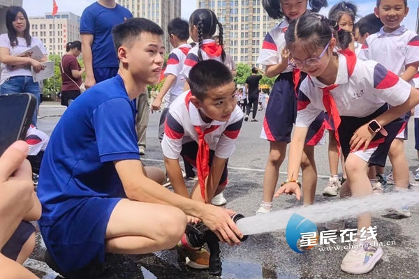 消防员叔叔讲解水带的使用原理。(照片均由各学校提供。)