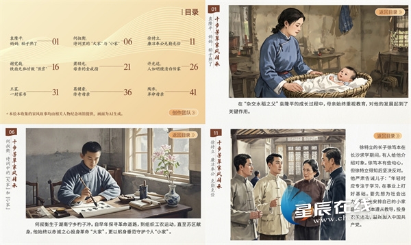 除了打造家风馆,长沙还结合长沙市丰厚的红色资源优势,收集发生在长沙的“家风家教家训”故事,在刘少奇同志纪念馆、隆平稻米博物馆等36个场馆建设家风实践点,并编制“十步芳草 家风传承”地图,引导全市未成年人参观学习,让未成年人在实地体验中感受优良家风的传承和力量。运用AI技术生成儿童绘本和家风视频,以生动形象的画面和简洁易懂的文字,将红色场馆中的家风故事呈现给孩子们,进一步增强家风教育的趣味性和吸引力。