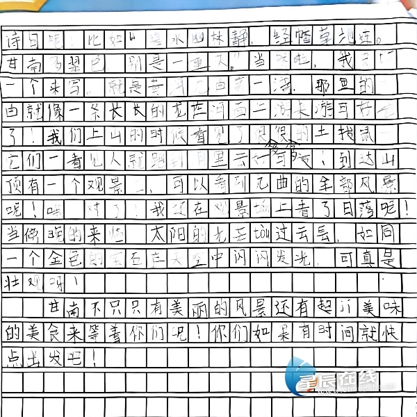 美丽的甘南有很多景点,到处都是奇特的风光。当然呢,也有诗人在甘南留下了无数诗句呢!比如“碧水幽林静,经幡草地连。甘南多翠色,别是一重天。”当然啦,我只选一个来写,就是黄河九曲第一湾。那里的九曲就像一条长长的龙在河面上游来游去,可好看了!我们上山的时候看见了很多很多的土拨鼠,它们一看见人就跑到洞里去,好可爱!到达山顶有一个观景台,可以看到九曲的全部风景。哦,对了,我还在观景台上看了日落呢!当傍晚来临,太阳的光芒透过云层,如同一个金色的宝石在天空中闪闪发光,可真是壮观呀!